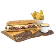 0 out of 5$6.500Trutro de pollo al cognac, papas hilo, queso mantecoso, cebolla caramelizada en pan ciabatta, acompañado con el caldo del pollo al cognac y papas rústicas.