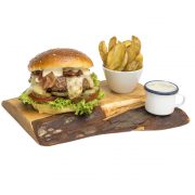 0 out of 5$6.900Hamburguesa compuesta por 2 cortes de vacuno y uno de cerdo, pepinillos, tocino, queso mantecoso, mayonesa casera, lechuga y tomate en pan frica, acompañada con salsa de queso azul y papas rústicas.