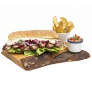Ingredientes: Filete de res adobado con aliños peruanos, preparado al wok con cebolla morada, queso mantecoso y mayonesa al ajo, en pan ciabatta.